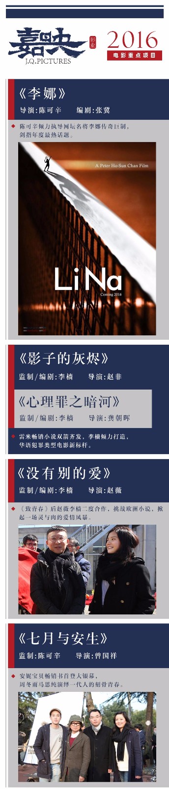 從片單中不難看出,嘉映影業(yè)的片單中,最為重要的創(chuàng)作者便是之前有著良好合作關系的知名導演陳可辛和著名編劇李檣。陳可辛導演備受關注的影片《李娜》也是片單中最受期待的影片之一,據(jù)悉影片前期大量的籌備工作正在有條不紊地穩(wěn)步推進;而除此之外,由陳可辛監(jiān)制,曾國祥導演,改編自安妮寶貝超高人氣青春小說《七月與安生》已經(jīng)于今年2月完成了全部拍攝,正在緊鑼密鼓地進行后期制作環(huán)節(jié);而嘉映影業(yè)重磅打造的《中國往事》系列電影也已經(jīng)啟動,陳可辛導演也將作為這一系列影片的監(jiān)制為電影保駕護航。而除了已經(jīng)公布了開機消息的趙薇導演的第二部影片《沒有別的愛》,根據(jù)知名小說改編的《影子的灰燼》和《心理罪之暗河》也將由李檣操刀創(chuàng)作劇本并擔任監(jiān)制。
